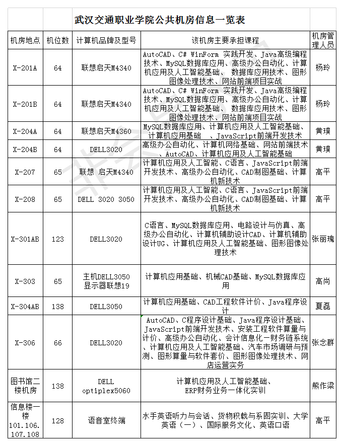 武汉交通职业学院多媒体及智慧教室信息一览表